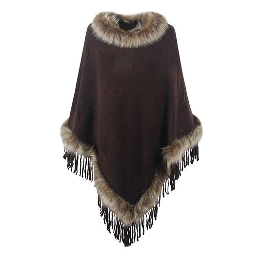 Damen eleganter Poncho mit luxuriösem Kunstfellkragen und dekadenten Fransen Amawinc