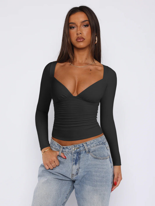 Damen figurbetontes Langarmoberteil mit V-Ausschnitt und Raffungen Amawinc