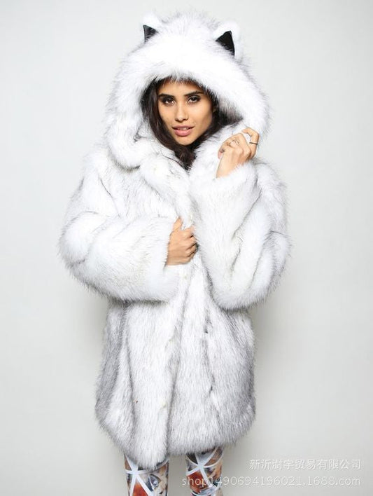 Damen Kuscheliger Kunstfell-Mantel mit Kapuze und Ohren Amawinc