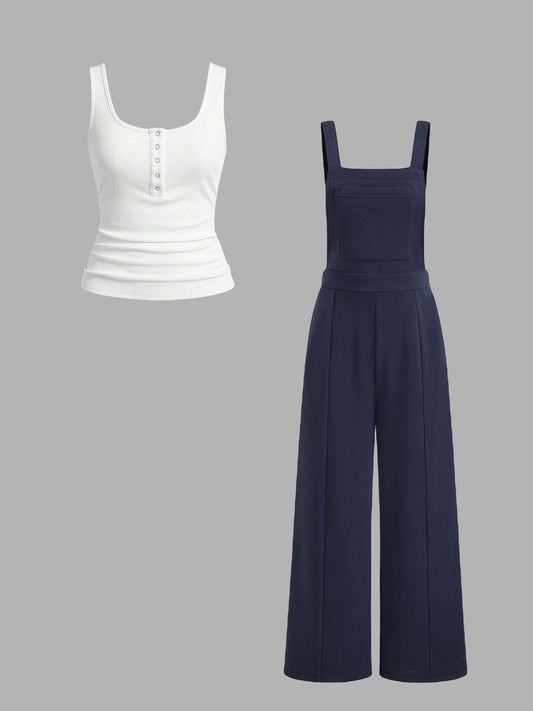 Damen lässiger Tank-Top und weit geschnittenen Latzhose Set Amawinc