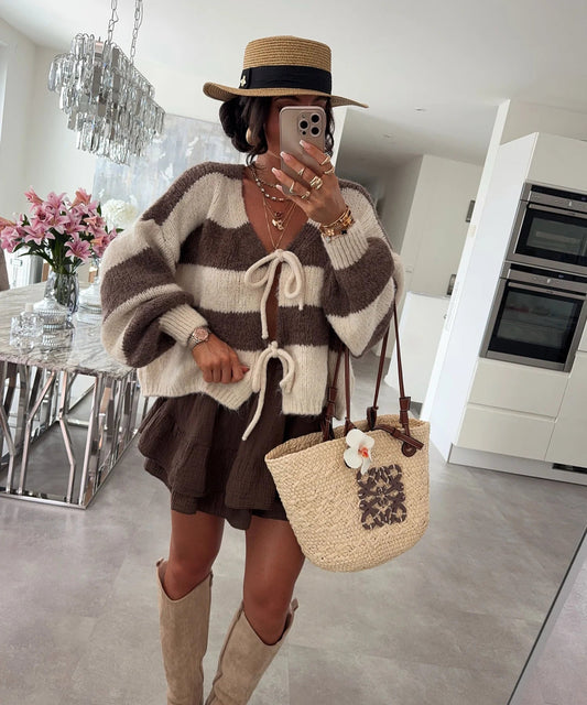 Damen lockere Strickjacke mit breiten Streifen und Bindegürtel Amawinc