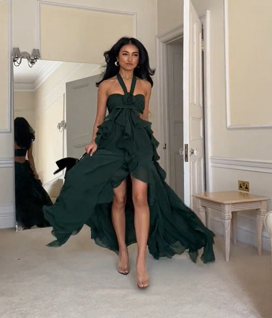 Damen Maxi-Brautkleid mit voluminösem Rüschendesign und elegantem Halterneck Amawinc