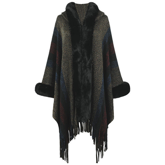 Damen modischer Poncho mit luxuriösem Kunstfellkragen und Fransen Amawinc