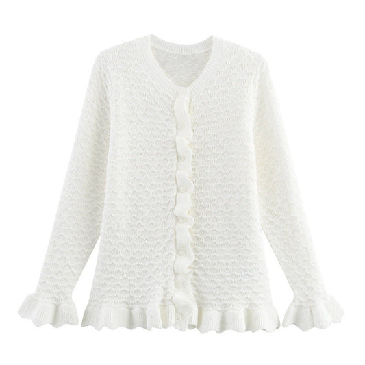 Damen Strickjacke mit Rüschensaum und Perlenknöpfen Amawinc