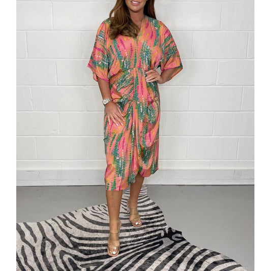 Stilvolles bedrucktes lässiges Maxikleid mit V-Ausschnitt von Fudus