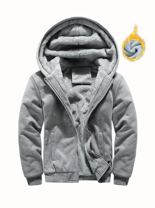Liazen Fleece Hooded Zipper Jacket, Solid Color Thick Casual Hoodie