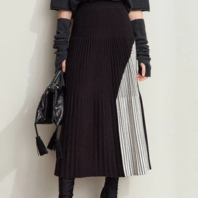 Schicker A-Linien-Rock in Wadenlänge mit einzigartigem Patchwork-Design, das solide und gestreifte Paneele für einen modernen Look kombiniert. Gefertigt aus einer weichen Strickmischung, ist dieser Rock ideal für Herbst und Winter. Erhältlich in Schwarz und Grau, bietet er einen vielseitigen Stil, perfekt für Büro-Outfits oder legere Ausflüge.