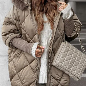 Fühlen Sie sich stilvoll und gut geschützt mit diesem winterlichen Outfit, das eine gepolsterte Jacke mit einer schicken Kapuze und einem ansprechenden Diamantmuster enthält.