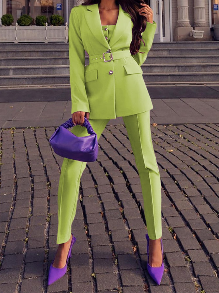 Dieses Zweiteiler-Set beinhaltet eine Hose mit hohem Bund und Reißverschluss und einen figurbetonten Blazer mit V-Ausschnitt und Gürtel. Angenehmer Tragekomfort und perfekte Passform.