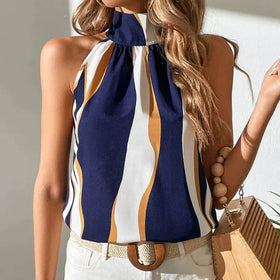 Ein bezauberndes, ärmelloses Trägertop in Marineblau-Weiß-Orange – ein echter Hingucker! Stil und Komfort vereint für Freizeit, Stadtbummel oder Büro.