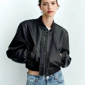 Entdecken Sie die moderne Schärfe und vielseitige Eleganz der Avelena Bomber Crop-Lederjacke: