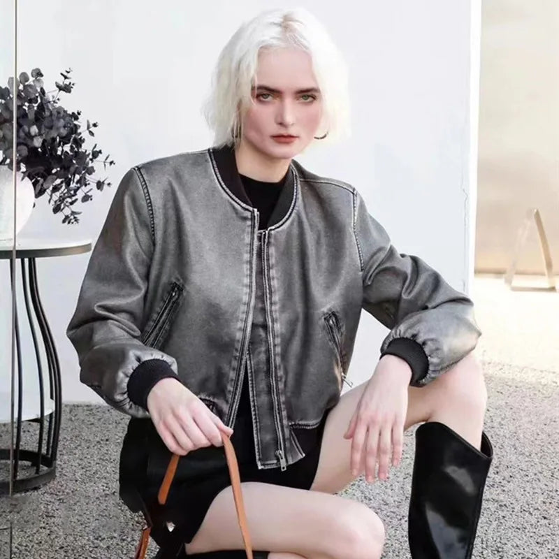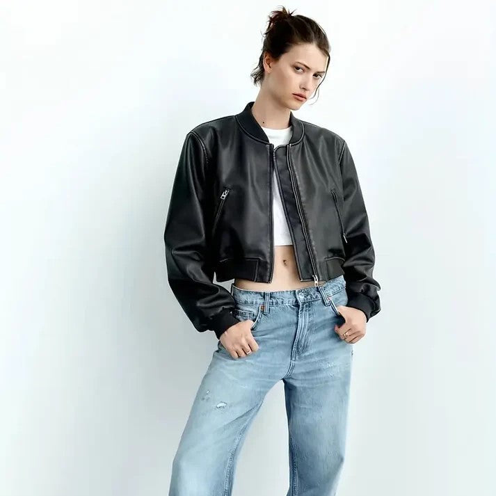 Avelena - Bomberjacke aus Kunstleder mit gerippten Ärmeln vereint zeitgenössische Freiheit und Anpassungsfähigkeit. Diese Bomberjacke besticht durch ihr stylishes Kunstlederdesign – einen modernen, urbanen Akzent für jedes Ensemble. – Die gerippten Ärmel und der Saum sorgen für eine körpernahe Passform und betonen die klassische Bomberform. – Ideal für Übergangszeiten verbindet Avelena Stil mit Funktionalität und ist unverzichtbar für jede modeaffine Garderobe.