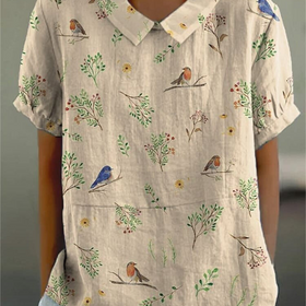 Baumwoll-Leinen Bluse für Damen: Legerer Schnitt mit Vogel-Zweig-Motiv von Fudus