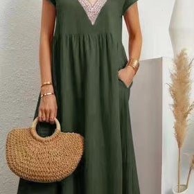 Sommerliches Emma-Kurzarm-Taschenkleid aus Baumwolle und Leinen. Locker, luftig und bequem. - V-Ausschnitt. - Praktische Taschen. Ein vielseitiges Kleid für jeden Anlass.