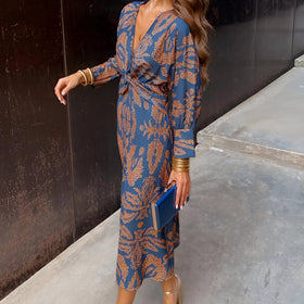 Stilvolles blaues und oranges Blumen-Midi-Kleid mit V-Ausschnitt. Ein Designer-Cocktailkleid mit kunstvollen Drucken und einem stylischen Knotendetail vorne.