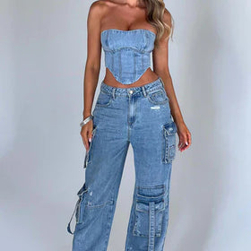 Die angesagte Coleen Cargohose, ein Must-have der Saison im kantigen 00er-Jahre-Stil, wertet Ihren Look auf. Diese Cargohose aus feinstem Denim in kräftigem Blau hat eine Oversize-Passform, weite Beine und Taschen.