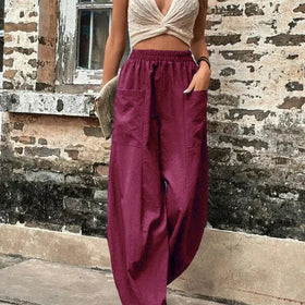 Cornelia Hosen im Vintage-Stil: gesmokte, hohe Taille, gerades, weites Bein, locker sitzende Lounge-Hose mit Taschen, Strandhose aus Leinen für Frauen. Fließend, bequem und schick.