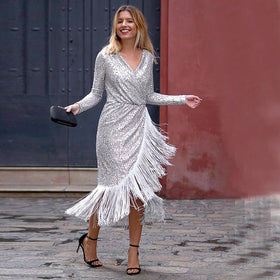 Damen Abendkleid mit glitzerndem Paillettenbesatz und fransierenden Akzenten Amawinc