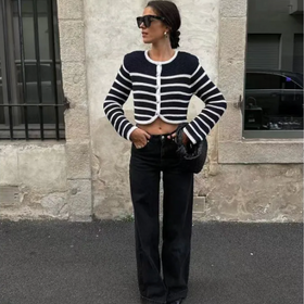 Dieser kurze, taillierte Cardigan mit schwarz-weißem Streifenmuster und Knöpfen ist eine zeitlose und elegante Wahl. Er verleiht in Kombination mit dem richtigen Kleid einen schicken und mühelos eleganten Look.