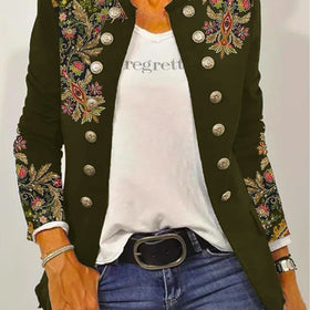 - Design: Das florale Muster und die kontrastierenden Knöpfe setzen modische Akzente und machen die Jacke zu einem echten Hingucker.