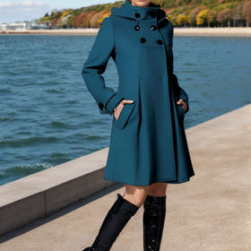 Entdecken Sie unseren eleganten Damenmantel mit hohem Kragen und funktionalen Taschen, ideal für die kalte Jahreszeit. Dieser stilvolle Mantel kombiniert modernes Design mit praktischem Nutzen.