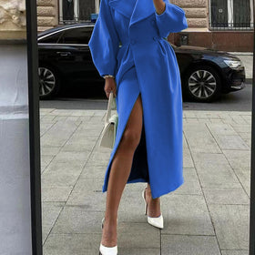 Damen eleganter Trenchcoat mit hohem Schlitz und Puffärmeln Amawinc
