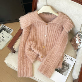 Damen Flauschige Strickjacke mit breitem Kragen und Knopfleiste Amawinc