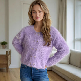 Damen flauschige Strickjacke mit herzförmigen Knöpfen und lockerer Passform Amawinc