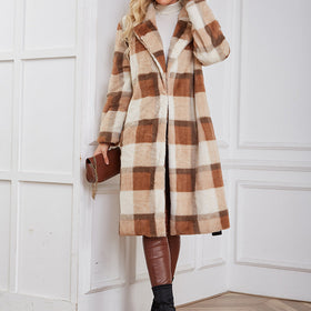 Damen Flauschiger Karomantel mit elegantem Revers und praktischen Taschen Amawinc