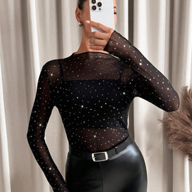 Entdecken Sie unser exquisit gestaltetes Damen Funktionsshirt aus transparenter Stoffqualität, das mit glitzernden Applikationen verziert ist. Perfekt für besondere Anlässe oder den Alltag, kombiniert dieses Shirt mühelos Stil und Komfort.