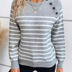 Damen gestreifter Pullover mit dekorativen Knopfdetails und Rundhalsausschnitt Amawinc