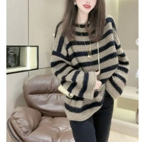 Damen Grobstrickpullover mit lässigem Streifenmuster und voluminösen Ärmeln Amawinc