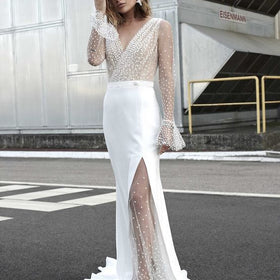 Dieses atemberaubende, hochgeschlitzte Abendkleid von Amawinc ist die perfekte Wahl für besondere Anlässe, bei denen Sie im Mittelpunkt stehen möchten. Mit seiner Kombination aus einem transparenten Oberteil, das mit funkelnden Perlen verziert ist, und einem eleganten, fließenden Rock kreiert es einen unvergesslichen Look.