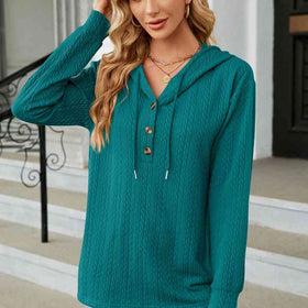 Dieser Hoodie verbindet zeitlosen Stil mit unvergleichlichem Komfort. Weiche, gerippte Textur, V-Ausschnitt und elegante Knopfdetails machen ihn perfekt für entspannte Stunden oder stilvolle Ausflüge.