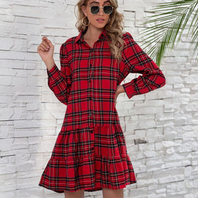 Damen Karokleid mit lässigem Hemdblusenstil und verspieltem Volant von Amawinc