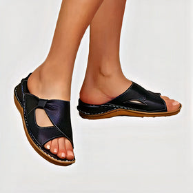 Genießen Sie stilvolle Leichtigkeit mit diesen bequemen Wedge-Sandalen für den ganzen Tag. Die weichen Lederriemen mit stilvollem Kreuz-Design und feinen Cutouts sorgen für eine elegante Note, während die gepolsterte Sohle angenehmen Tragekomfort bietet. Die rutschfeste Sohle verleiht sicheren Halt, perfekt für entspannte Spaziergänge und sommerliche Abenteuer.