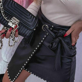 Damen Kunstleder-Minirock mit Dekorativen Perlen und Stylischem Bindegürtel Amawinc