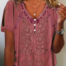 Damen Kurzarmbluse mit floralen Stickereien und Knopfdetails Amawinc