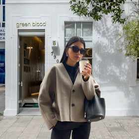 Entdecken Sie unsere Damen kurze Strickjacke, die perfekt für einen stilvollen und zugleich bequemen Look geeignet ist. Diese Jacke verfügt über elegante Knöpfe und einen großzügigen Schnitt, der hervorragenden Tragekomfort bietet. Sie ist aus hochwertigen Materialien gefertigt, um sowohl Wärme als auch eine angenehme Haptik zu gewährleisten.