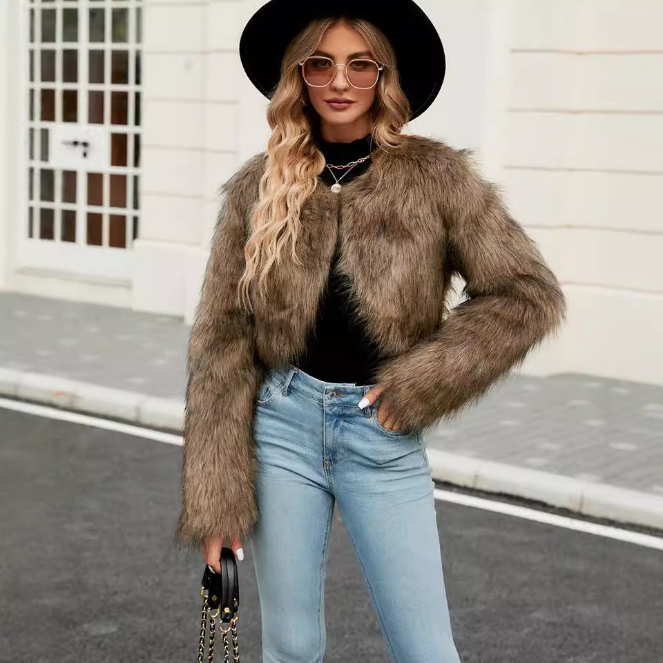 Damen Kurzjacke aus Kunstpelz mit weitem Schnitt und flauschigen Ärmeln Amawinc