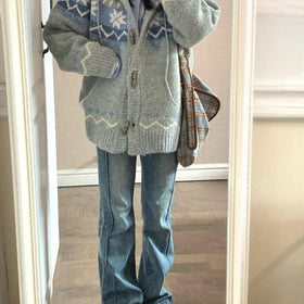 Damen kuschelige Strickjacke mit hohem Kragen und Ornamenten Amawinc