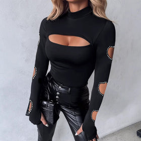 Entdecken Sie unser stilvolles Damen Langärmliges Oberteil mit einzigartigem Cut-Out-Design und dekorativen Details. Dieses Oberteil vereint Komfort und Eleganz für jede Gelegenheit. Der hochgeschlossene Ausschnitt sorgt für einen modernen Look, während die exklusiven Cut-Outs im Brust- und Armbereich für einen Hauch von Raffinesse sorgen.