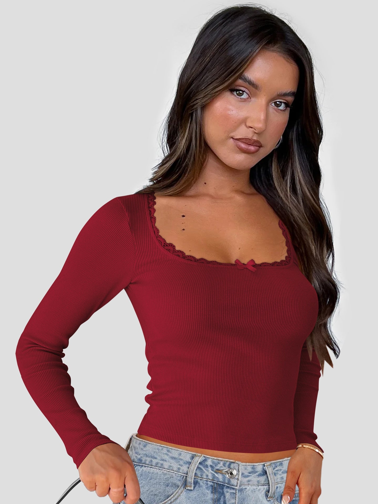 Damen Langarmoberteil mit feiner Spitzenkante und figurbetontem Schnitt Amawinc