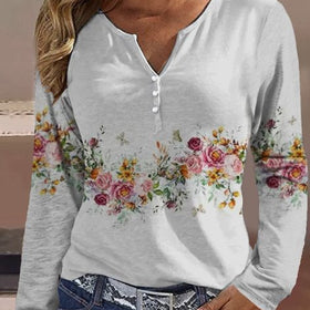 Damen Langarmshirt mit floralem Motiv und Knopfdetails Amawinc