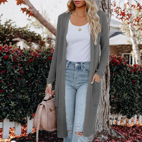 Damen langer Strickcardigan mit offenen Taschen und feinem Rippdesign Amawinc