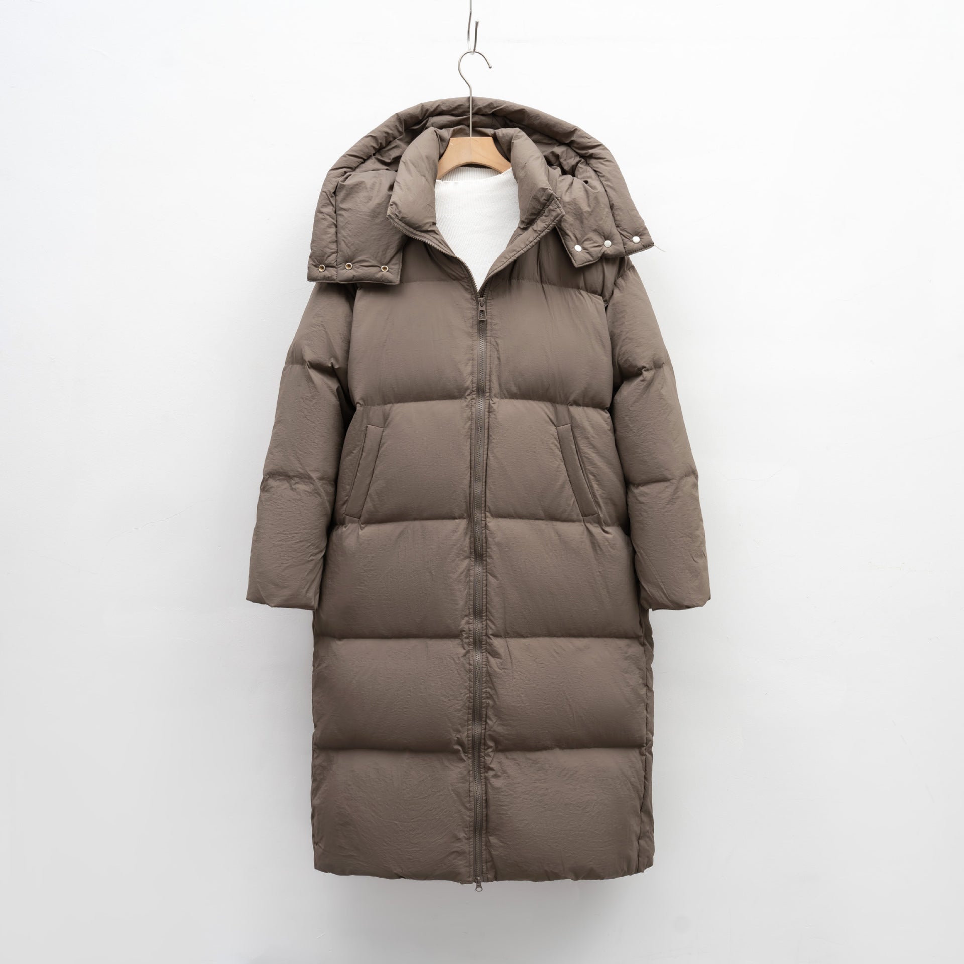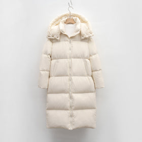 Damen Langer volumenreicher Daunenmantel mit abnehmbarer Kapuze und seitlichen Taschen Amawinc