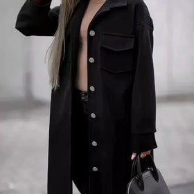 Die Elvire-Langmanteljacke verbindet lässigen Stil mit elegantem Schnitt – perfekt für vielseitige Oberbekleidung. Hemdartiges Design mit Knöpfen & Brusttaschen für lässigen Chic. Lange Länge & hochwertiger Stoff für Komfort & Wärme, ideal für Lagenlook bei kühlerem Wetter.