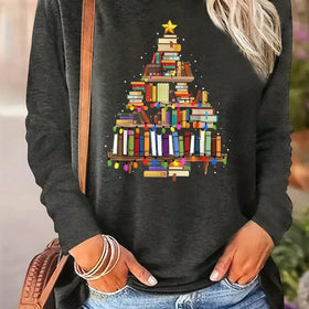 Damen lässiger Langarm-Pullover mit festlichem Bücher-Motiv Amawinc