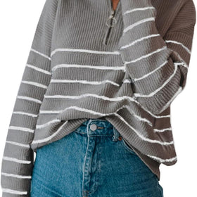 Damen lässiger Pullover mit kurzem Reißverschluss und Streifenmuster Amawinc