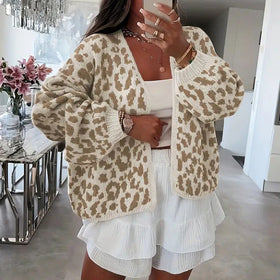 Entdecken Sie diesen lässigen Strickcardigan, der mit seinem eleganten Leopardenmuster und dem bequemen Schnitt sowohl für entspannte Tage zuhause als auch für modische Ausflüge perfekt geeignet ist. Dieser Cardigan kombiniert Komfort und Stil in einem.